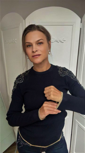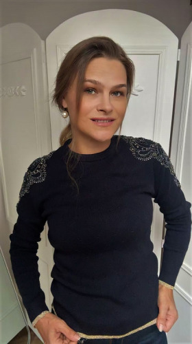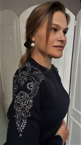 Zdobienie zachwyca nie tylko dużym dekorem ale również kolorystyką wkomponowanych kryształów, które jest spójne z kolorem dzianiny, dzięki temu wygląda tak subtelnie i elegancko.