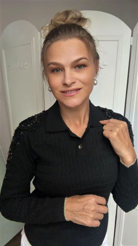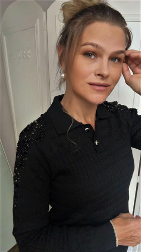 Zdobienie zachwyca nie tylko dużym dekorem ale również kolorystyką wkomponowanych kryształów, które jest spójne z kolorem dzianiny, dzięki temu wygląda tak subtelnie i elegancko.