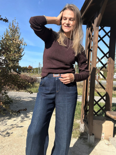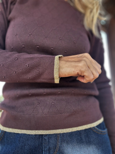 Dzianina bardzo elastyczna i miękka i nie bardzo gruba, kontrastowa lamówka ze złotą nicią, na zakończeniu dołu i rękawów.