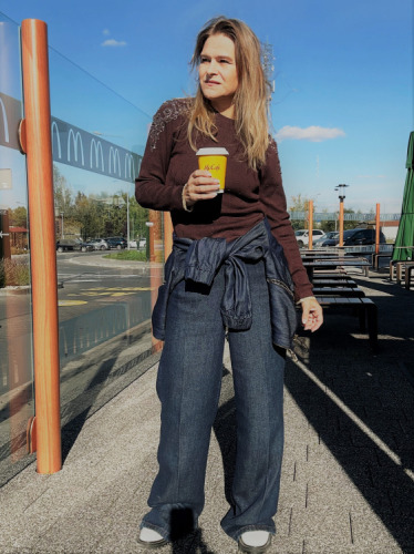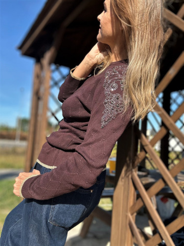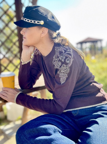 Zdobienie zachwyca nie tylko dużym dekorem ale również kolorystyką wkomponowanych kryształów, które jest spójne z kolorem dzianiny, dzięki temu wygląda tak subtelnie i elegancko.