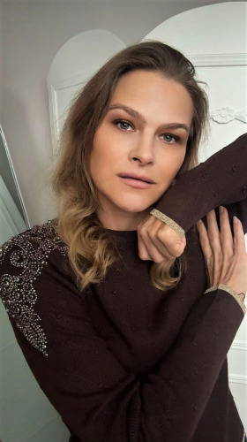 Dzianina bardzo elastyczna i miękka i nie bardzo gruba, kontrastowa lamówka ze złotą nicią, na zakończeniu dołu i rękawów.