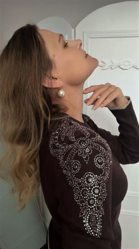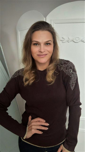 Zdobienie zachwyca nie tylko dużym dekorem ale również kolorystyką wkomponowanych kryształów, które jest spójne z kolorem dzianiny, dzięki temu wygląda tak subtelnie i elegancko.