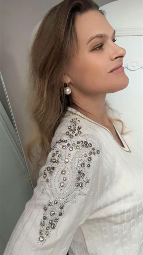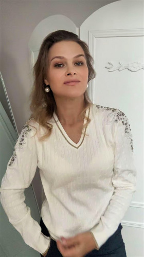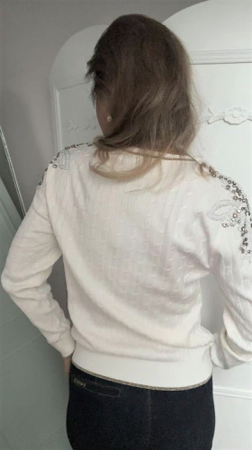 Zdobienie zachwyca nie tylko dużym dekorem ale również kolorystyką wkomponowanych kryształów, które jest spójne z kolorem dzianiny, dzięki temu wygląda tak subtelnie i elegancko.