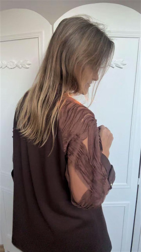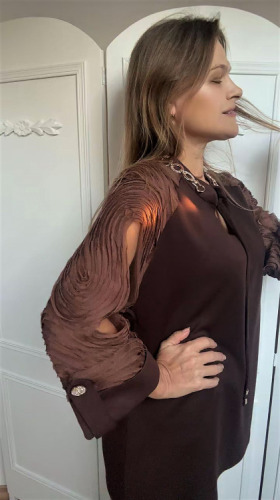 ELEGANCKA BLUZKA CZEKOLADA PIĘKNE RĘKAWY I STÓJKA