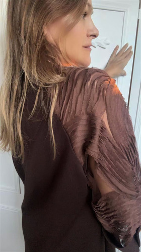 Precyzyjne przeszycia rękawa poprowadzone w falisty wzór - dają małe przebłyski ciała bo to cienki siatkowy materiał naszyty dubeltowo na transparentną tkaninę która jest bazą rękawa - siatka jest miękka i komfortowa - nie drapie.