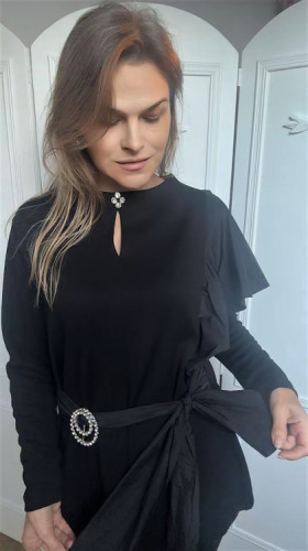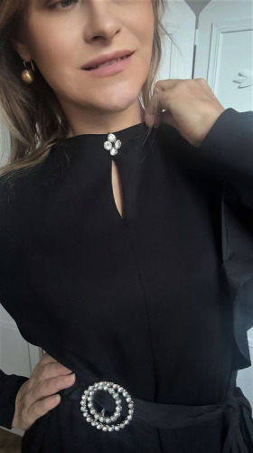 ELEGANCKA CZARNA TUNIKA Z FALBANĄ I BIŻUTERYJNYMI DETALAMI