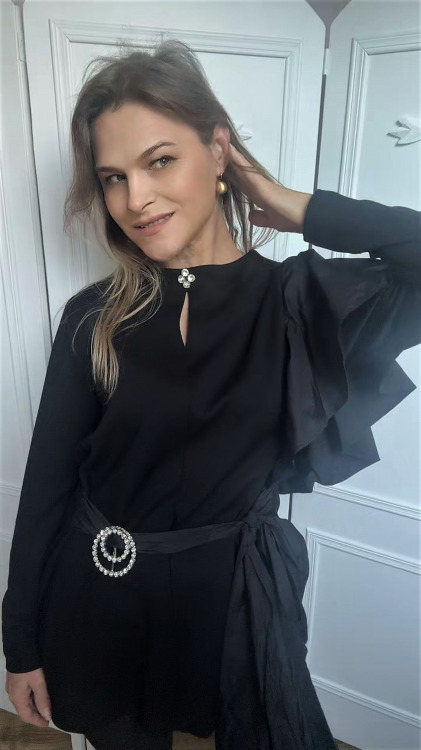 tunika czarna elegancka, tunika z falbaną, tunika z paskiem, tunika asymetryczna, tunika czarna damska, tunika wizytowa, elegancka tunika na wyjście, modna tunika 2025, tunika z ozdobą przy dekolcie, designerska tunika czarna