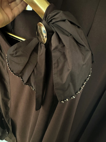 Bluzka ma oryginalne detale – dużą kokardę przy ramieniu z metalową okrągłą gładką broszką, którą można odpiąć.