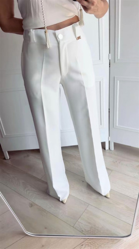 Spodnie o prostym, lekko rozszerzanym kroju wysmuklają nogi i idealnie komponują się z dopasowaną marynarką oraz topem, tworząc harmonijną i bardzo elegancką stylizację.