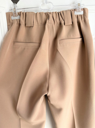 Spodnie o prostym, lekko rozszerzanym kroju wysmuklają nogi i idealnie komponują się z dopasowaną marynarką oraz topem, tworząc harmonijną i bardzo elegancką stylizację.