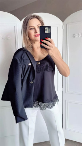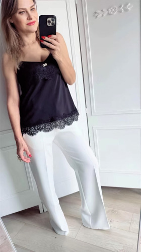 Spodnie o prostym, lekko rozszerzanym kroju wysmuklają nogi i idealnie komponują się z dopasowaną marynarką oraz topem, tworząc harmonijną i bardzo elegancką stylizację.