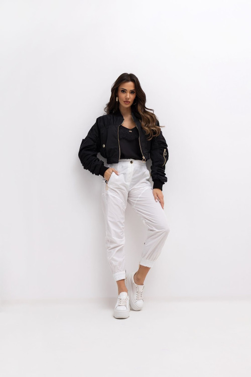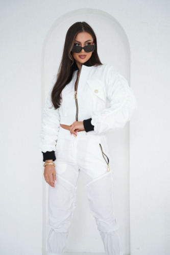białe spodnie damskie, spodnie damskie bojówki, spodnie białe, spodnie marszczone, spodnie z ekspresami, modne białe bojówki damskie , modne białe spodnie damskie , spodnie streetwear damskie, spodnie sportowe białe z zamkami, spodnie na wiosnę