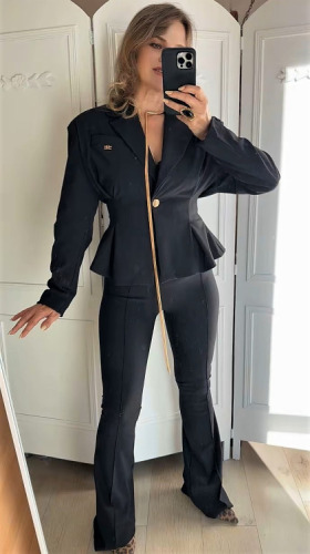 Doskonale wypadają z marynarką taliowaną La Diva Mia z tej samej tkaniny, której taliowanie i długość wpłynie pozytywnie na całokształt - głownie też z tego powodu że kieszenie z tyłu spodni pozostają widoczne a nie zasłonięte.
