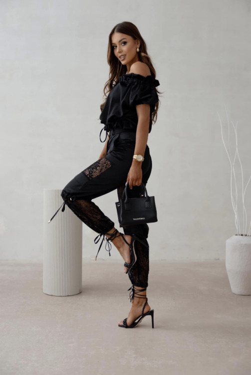Efektowne spodnie z tkaniny satynowej z koronkowymi wstawkami