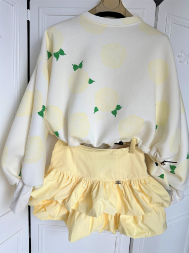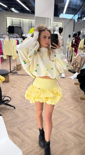 Oversize’owy krój z bufiastymi rękawami nadaje sylwetce lekkości i nowoczesnego charakteru, a subtelny cytrynowy print na białym wprowadza świeży, wiosenno-letni klimat.