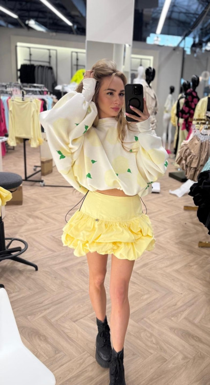 Tworzy znakomity total look ze spodniami oraz spódnico spodenkami spod flagi tej marki