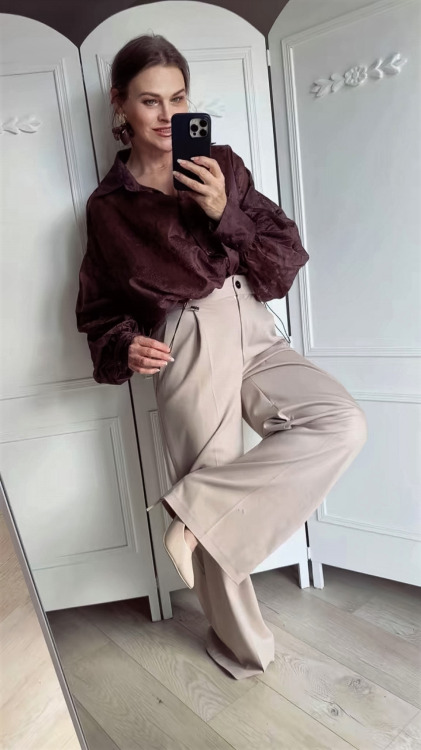 Spodnie z wysokim stanem, z ładnie zebranymi zaszewkami od talii, o prostym, rozszerzanym fasonie - wyciągają optycznie sylewtkę i idealnie komponują się z dopasowaną marynarką, tworząc harmonijną i bardzo stylową stylizację.