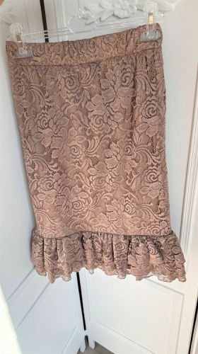 Elegancka spódnica midi z miękkiej elastycznej koronki w modnym odcieniu beżu - taupe