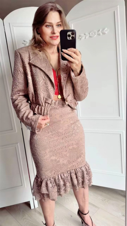 Polecamy do spodni żakiet w wersji za biodra lub krótki, w tym samym odcieniu oraz wzorze koronki