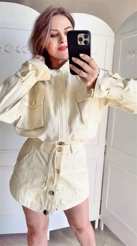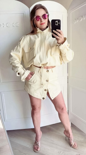 żółte szorty damskie, spódniczko spodenki masełko, szorty Lavestino, szorty wysoki stan, eleganckie szorty damskie, spodenki denimi, modne szorty damskie 2026, spódnico-spodenki stylowe, krótkie spodenki damskie premium, bawełniane spodenki z guzikami