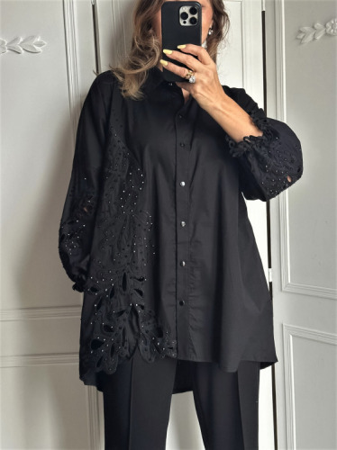 czarna koszula damska elegancka, koszula damska z haftem, koszula ażurowa damska, długa koszula czarna, koszula oversize damska, koszula z ozdobnym dołem, koszula wizytowa damska, romantyczna koszula damska, modna czarna koszula 2026, koszula na wiosnę lato damska, butik odzież damska online