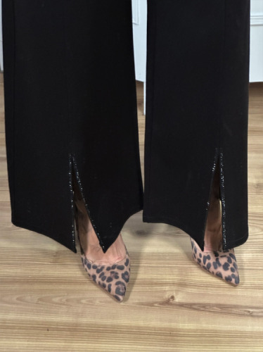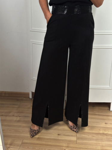 w pasie szeroka guma w cały tunel pasa obszyta dookoła kryształową taśmą oraz ozdobnik kryształowy cienki na wykończeniu rozporka na dole nogawki który jest zakończeniem pionowego przeszycia.