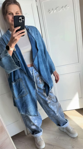 Wygodne, spodnie jak jeansy - efekt spranego denimu podkreślają modowy, nieco artystyczny styl spodni
